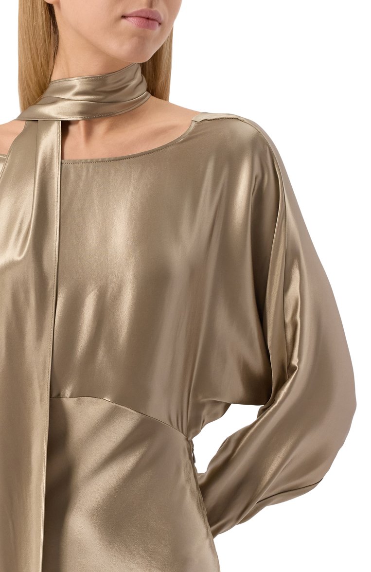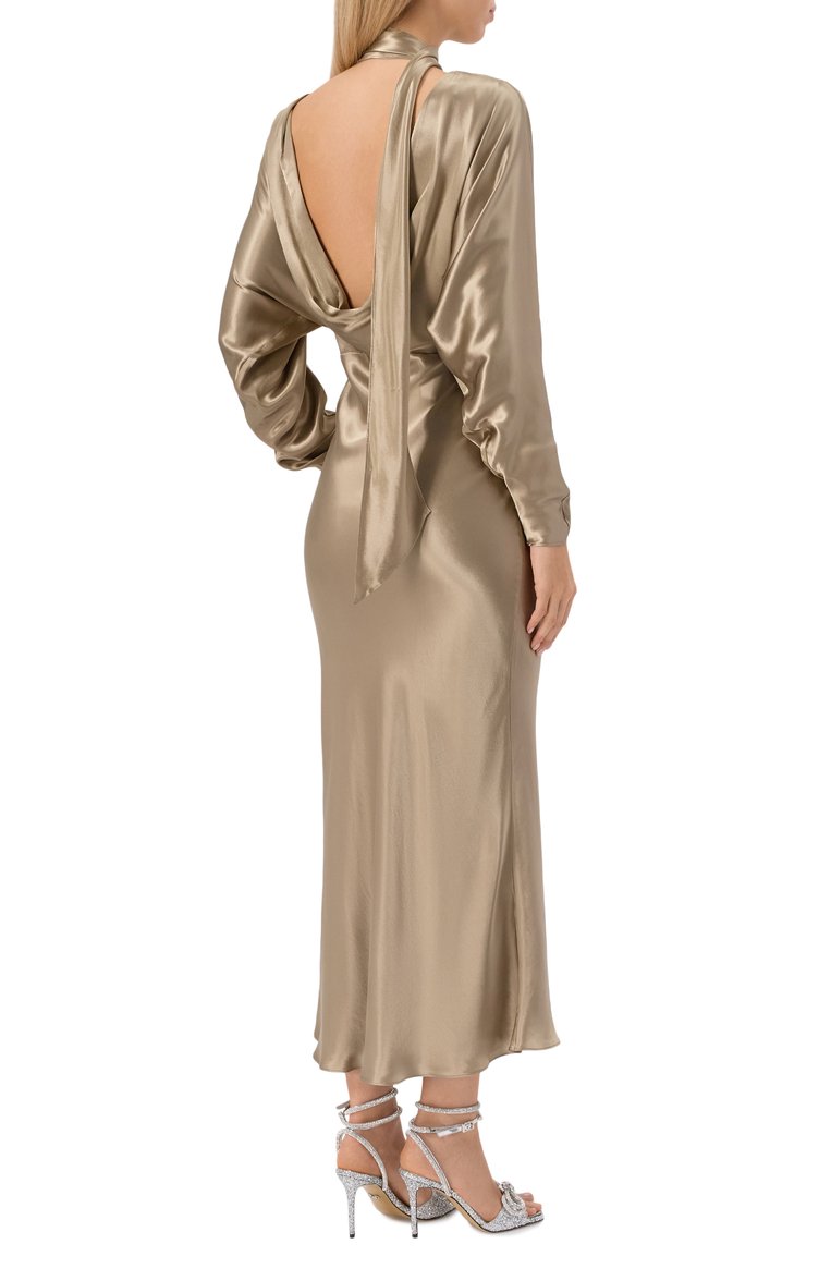 Длинное платье с завышенной талией и драпировкой на открытой спине выполнили из блестящего вискозного атласа. Модель с потайной боковой молнией и рукавами «летучая мышь» дополнили шарфом-лентой.