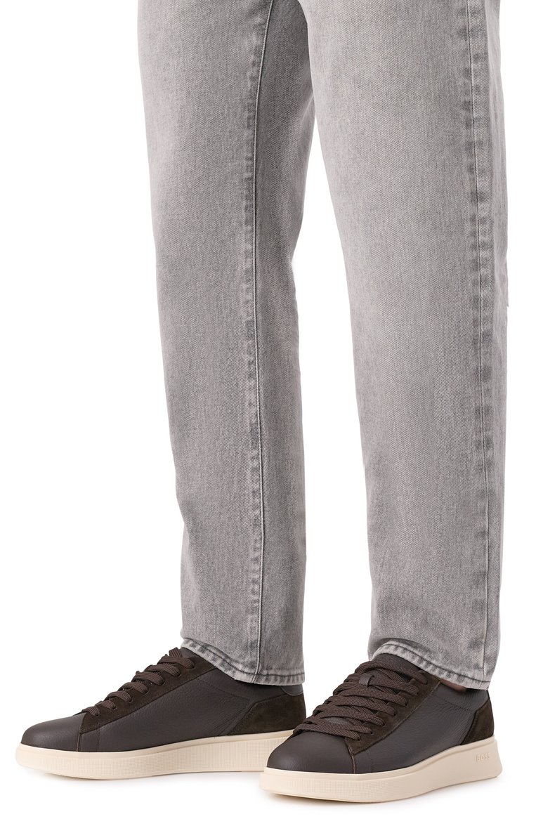 Кеды Bulton на контрастной брендированной подошве выполнили из крупнозернистой кожи и замши. Задник модели украсили полосатой вставкой в цветах фирменного триколора
